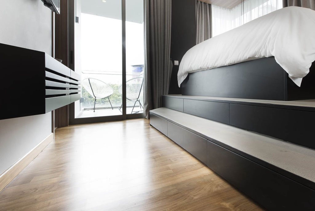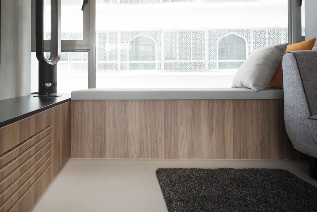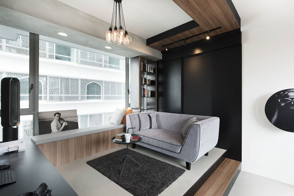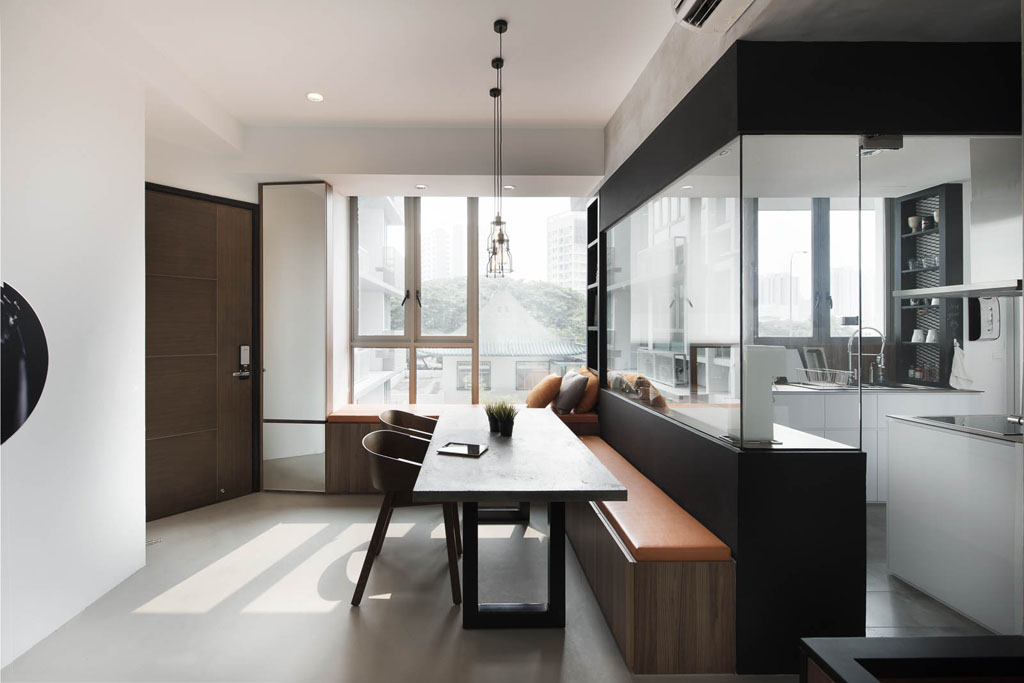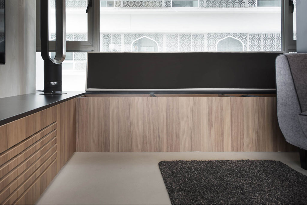 Two distinct 'objects' were conceptualized to have that clarity in the small space; the kitchen and living. The kitchen is designed as a 'black box' that extends into the dining area with the bay window transformed into booth seats. The elevated living room framed up by 'black lines' provided a continuity between functions, i.e from TV console, to bay window seats that serves as storage, before ending at the platform steps which also provides shoe storage. This same clean industrial look is continued in the master bedroom with the bed elevated for effective use of bay window for the headboard, storage and seating.
