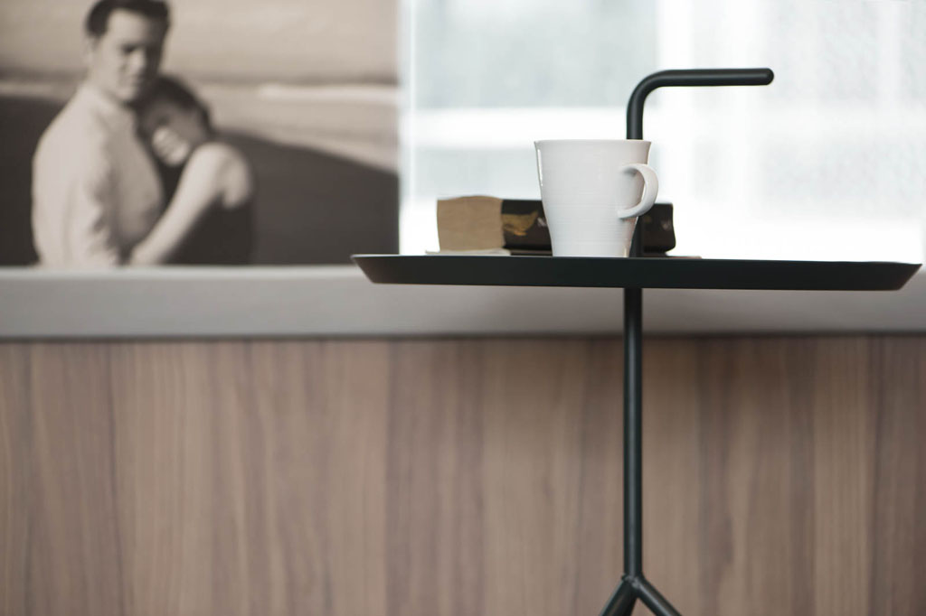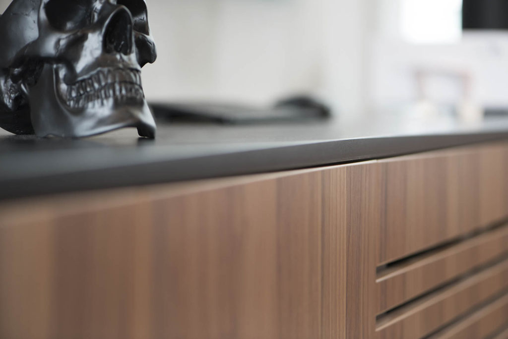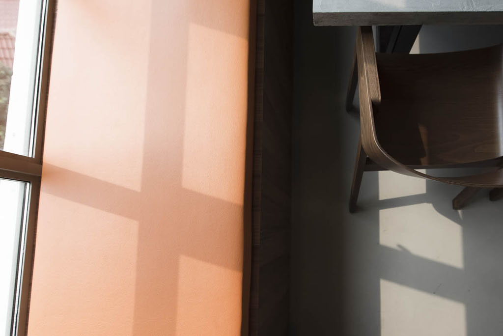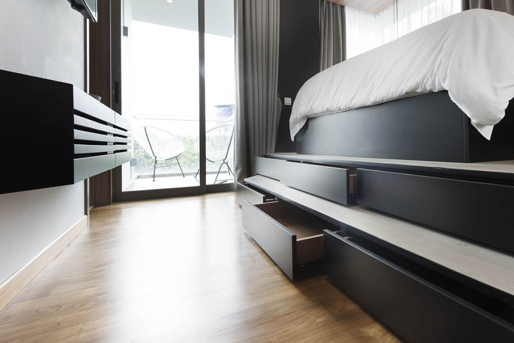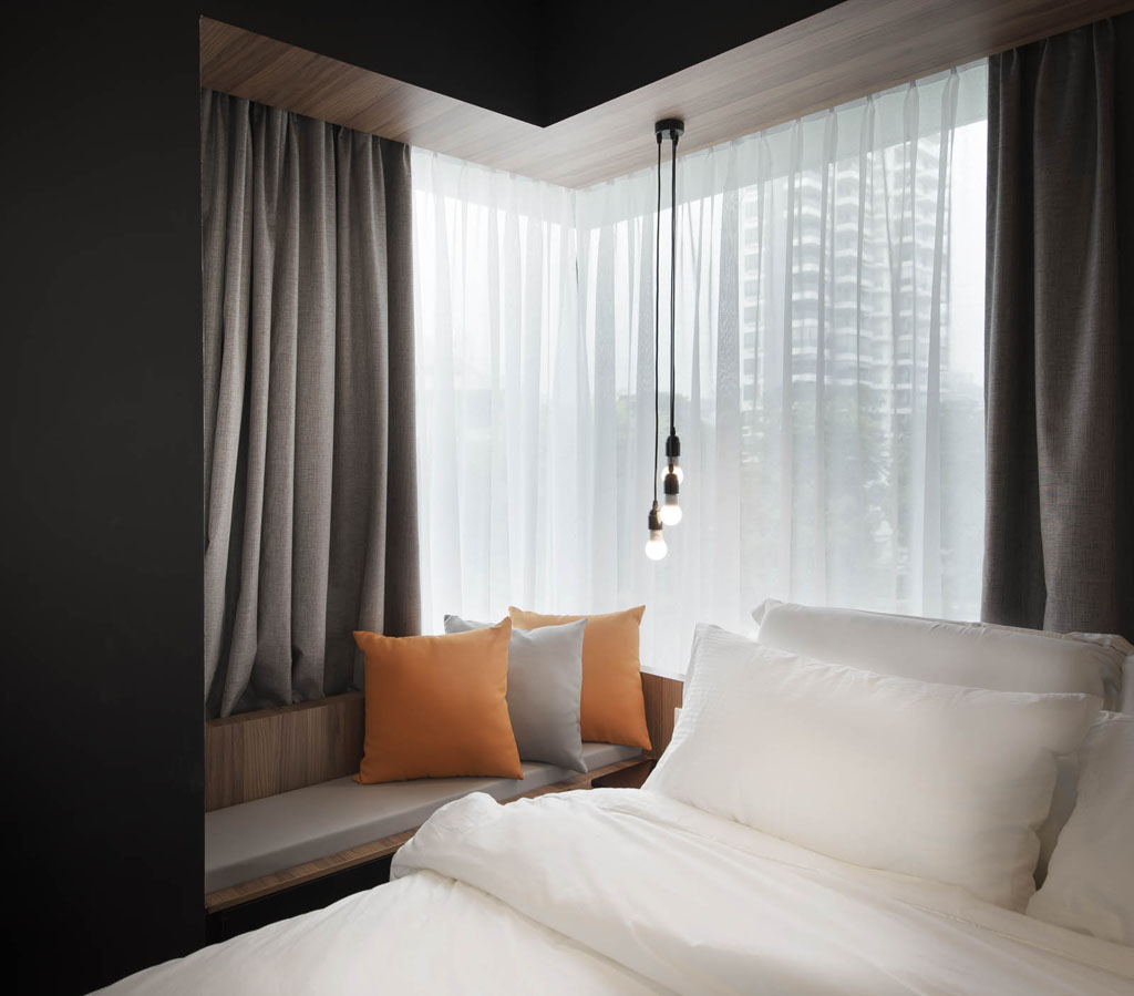 Two distinct 'objects' were conceptualized to have that clarity in the small space; the kitchen and living. The kitchen is designed as a 'black box' that extends into the dining area with the bay window transformed into booth seats. The elevated living room framed up by 'black lines' provided a continuity between functions, i.e from TV console, to bay window seats that serves as storage, before ending at the platform steps which also provides shoe storage. This same clean industrial look is continued in the master bedroom with the bed elevated for effective use of bay window for the headboard, storage and seating.