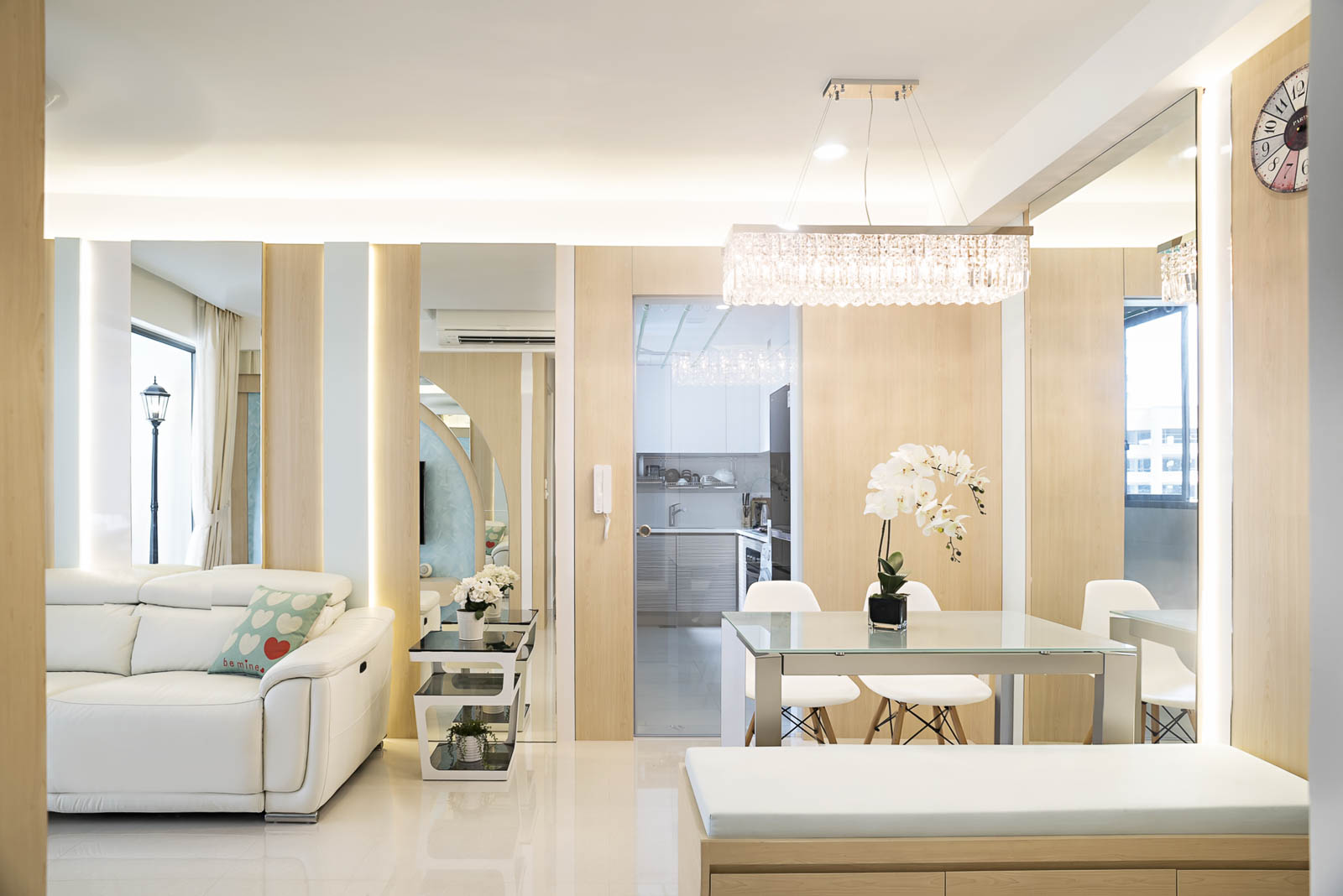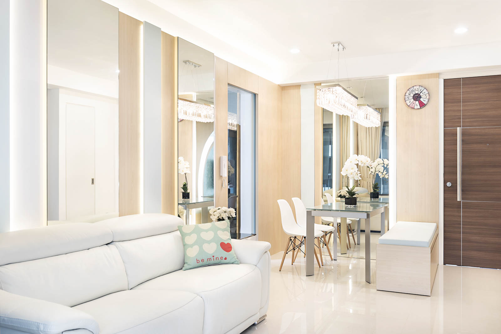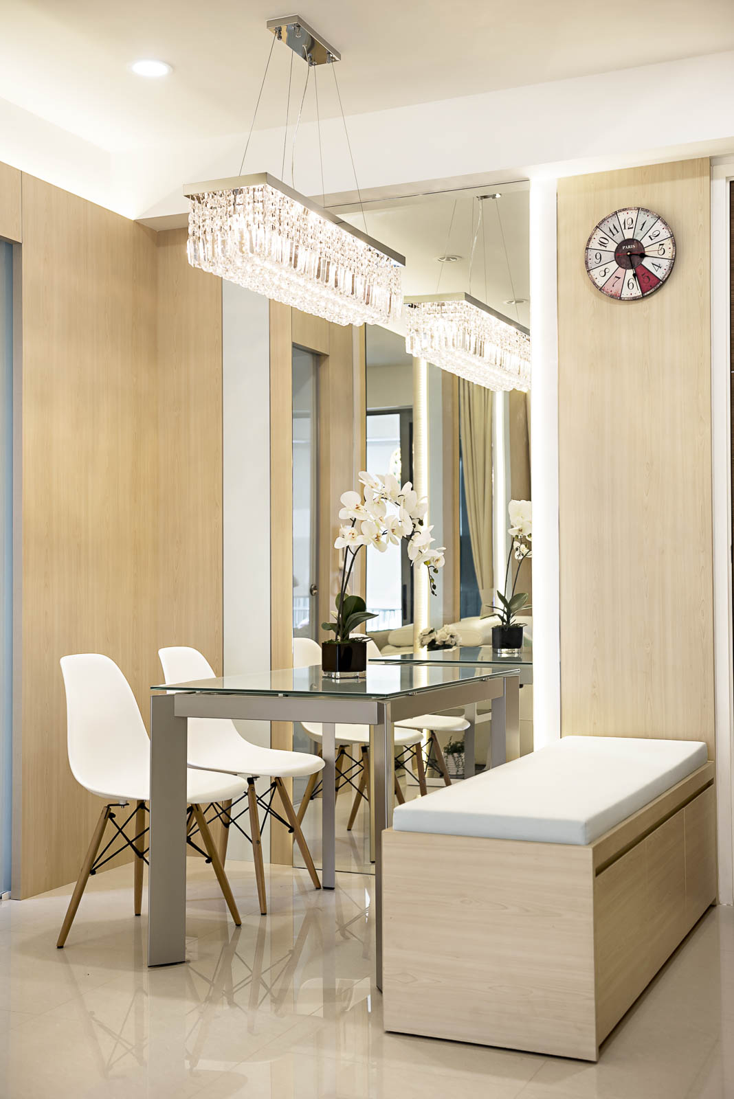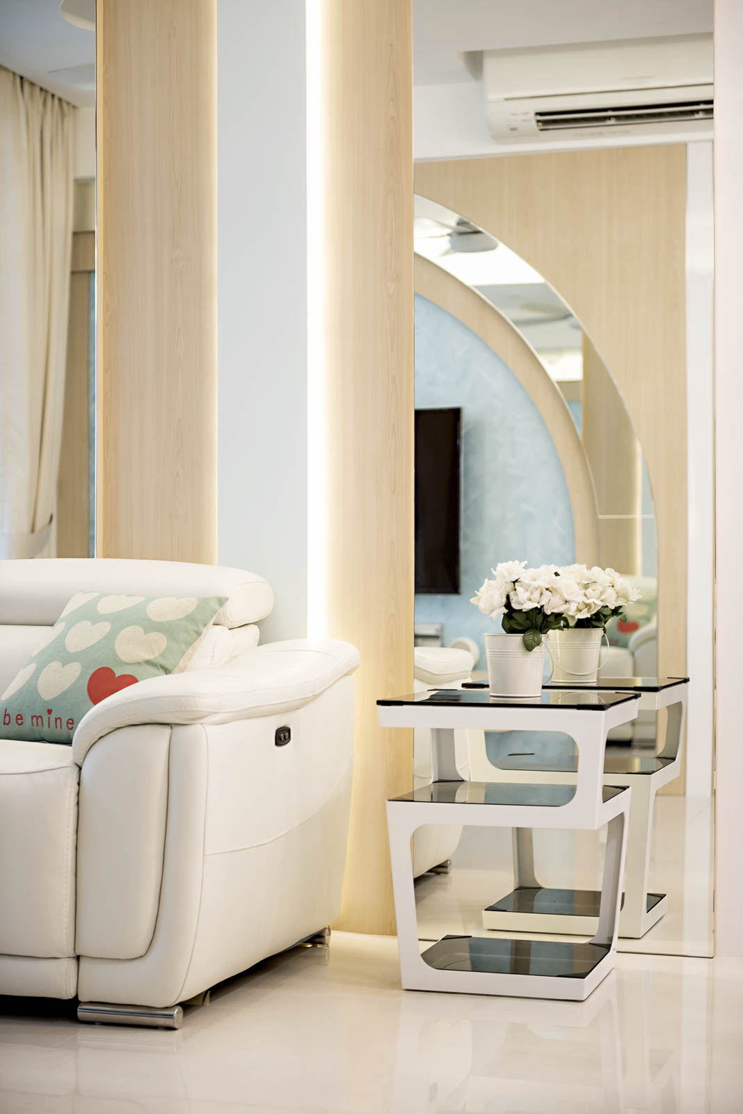 Biggest challenge of this project comes from unifying the couple's different aesthetics preferences. Yet what's beautiful in the design process comes from sieving out their common loves to create this union. Both love blue, light timber, spaciousness and mood lighting. Layered vertical panels clad in mirror, timber, white and blue laminates sets the tone for the living and dining room while we see the same verticality carried through to the master bedroom with a a richer material palette of browns and brass to give that luxurious mood that both enjoy.