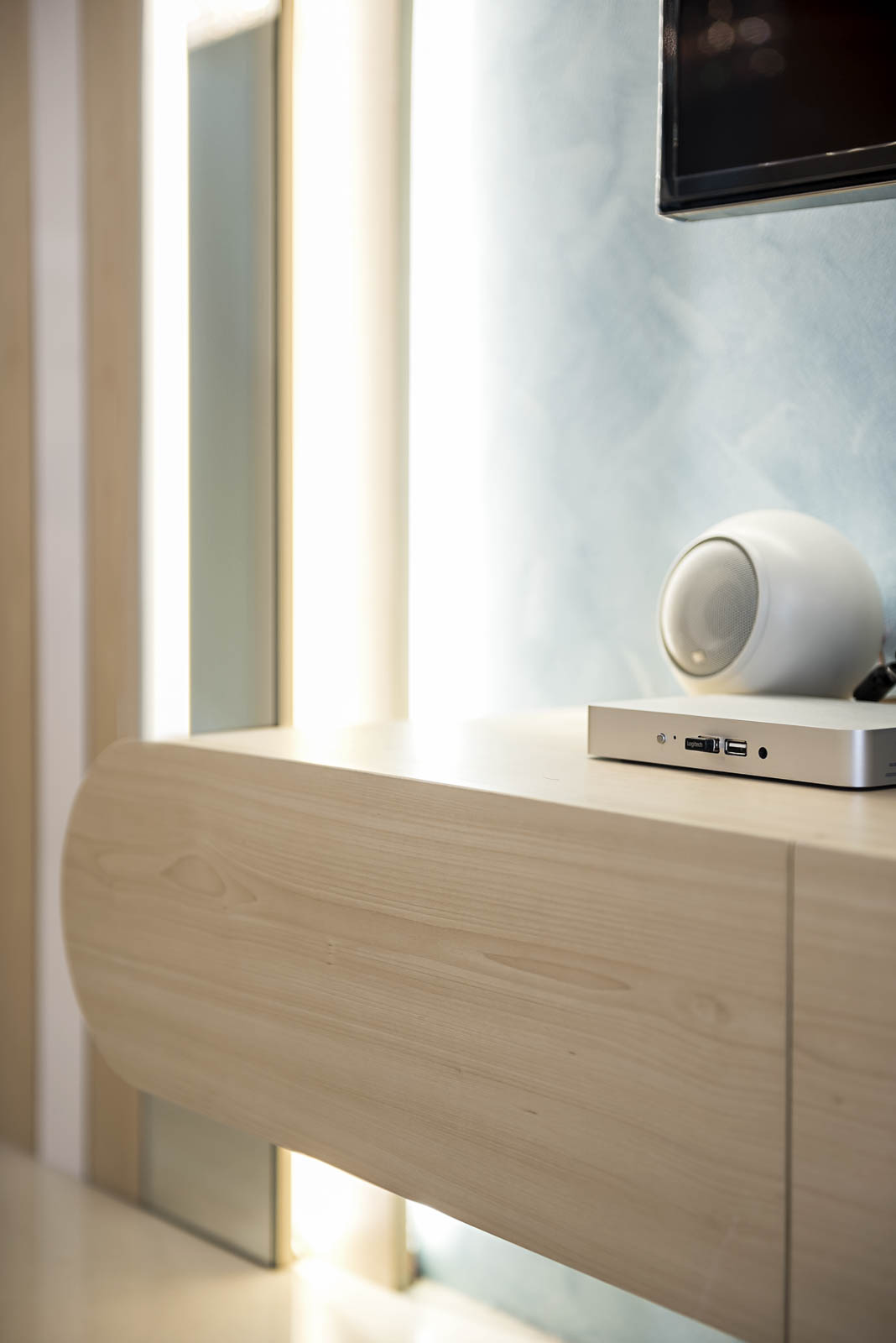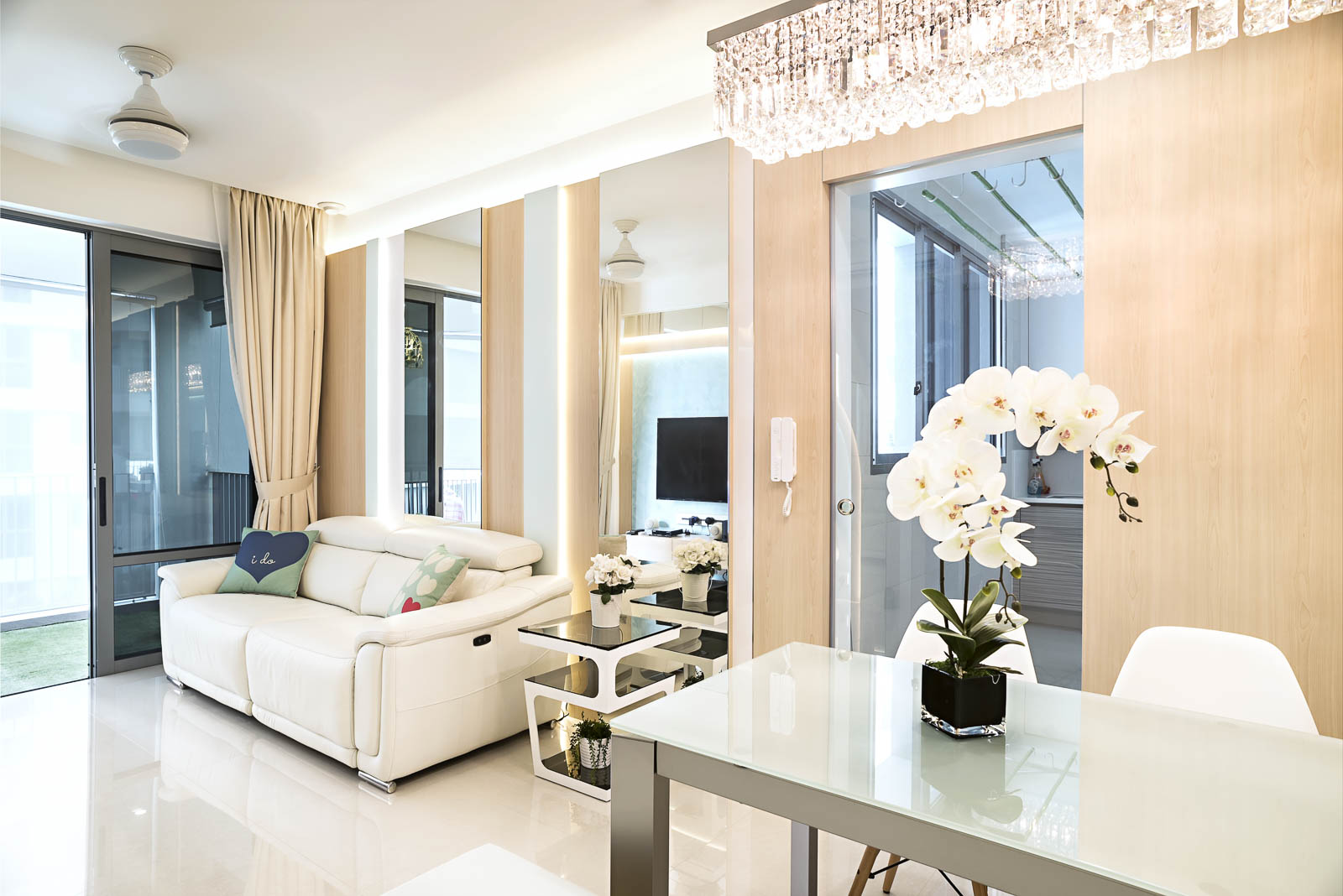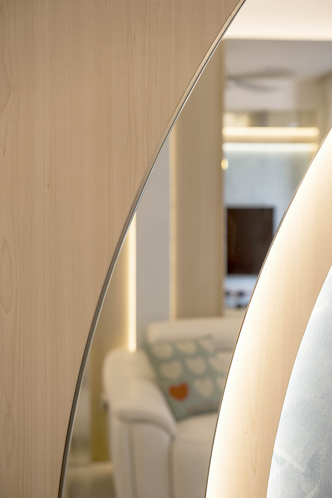 Biggest challenge of this project comes from unifying the couple's different aesthetics preferences. Yet what's beautiful in the design process comes from sieving out their common loves to create this union. Both love blue, light timber, spaciousness and mood lighting. Layered vertical panels clad in mirror, timber, white and blue laminates sets the tone for the living and dining room while we see the same verticality carried through to the master bedroom with a a richer material palette of browns and brass to give that luxurious mood that both enjoy.
