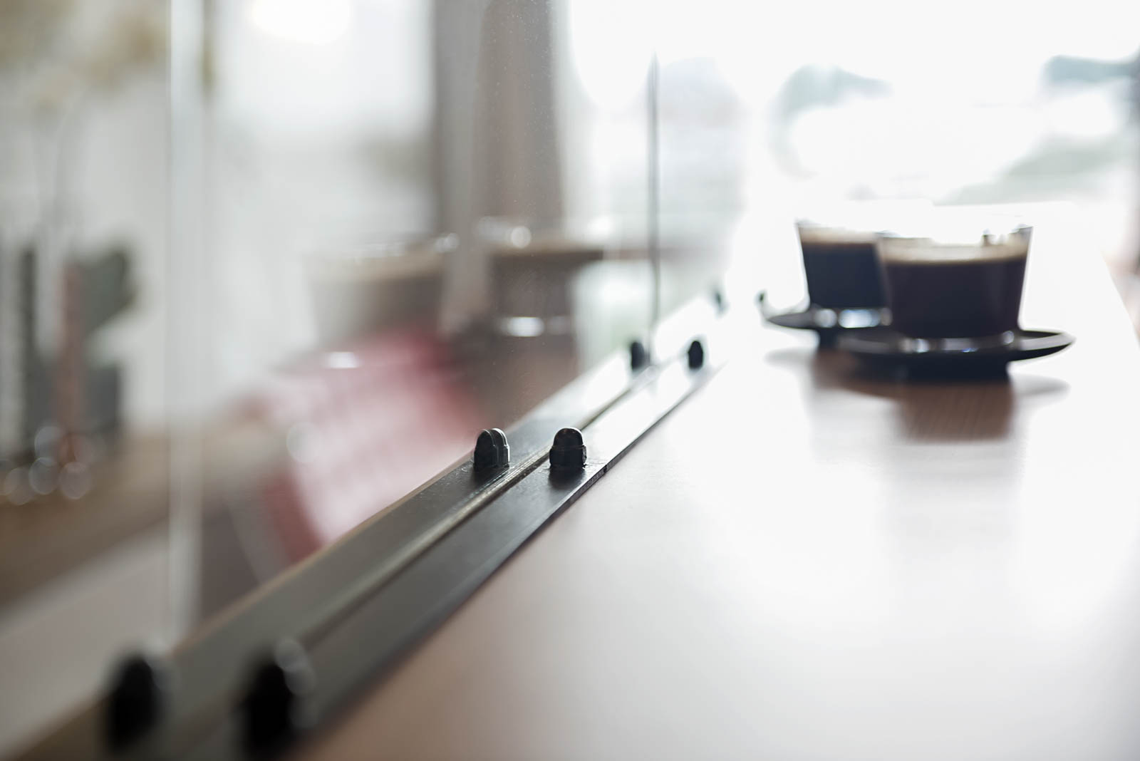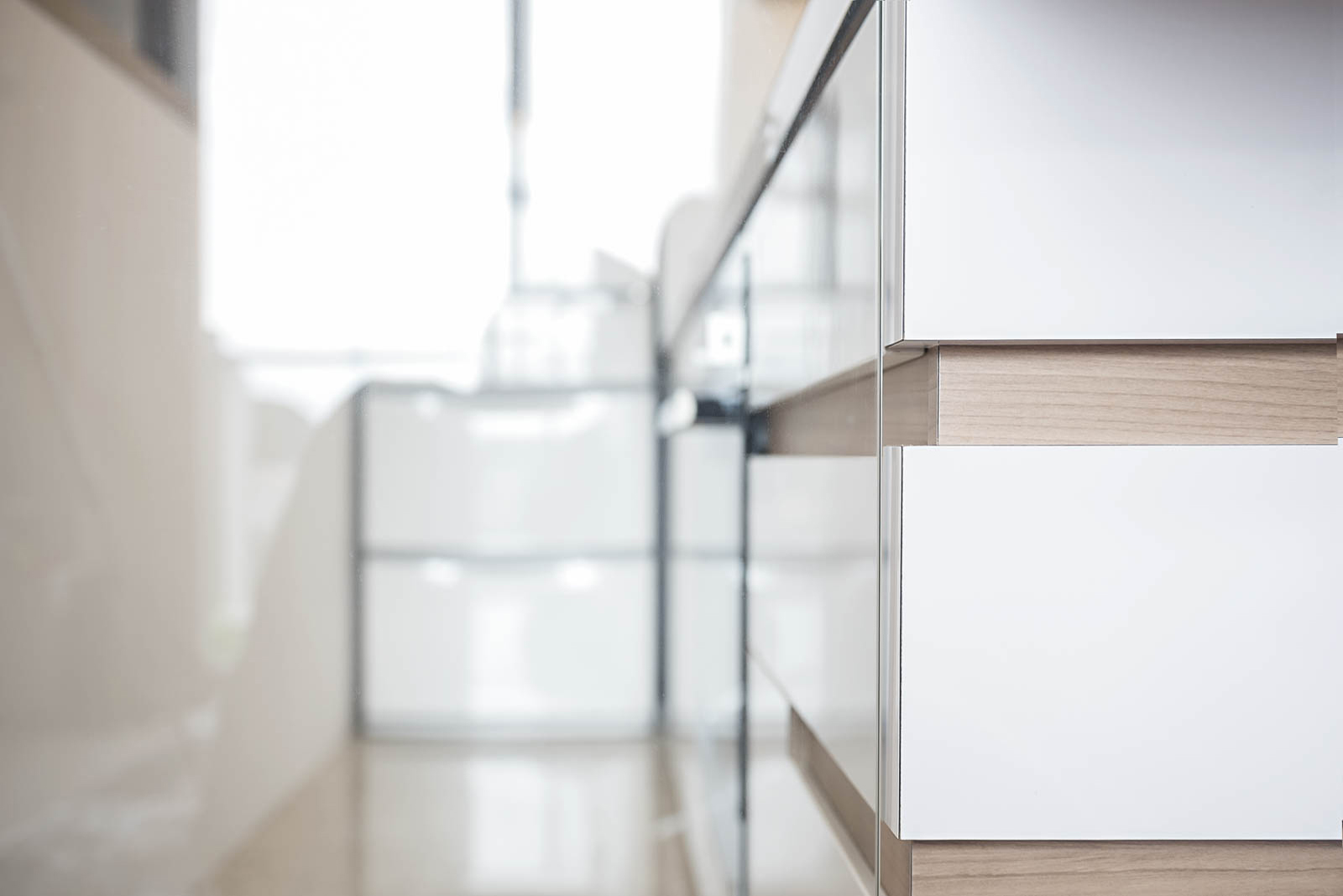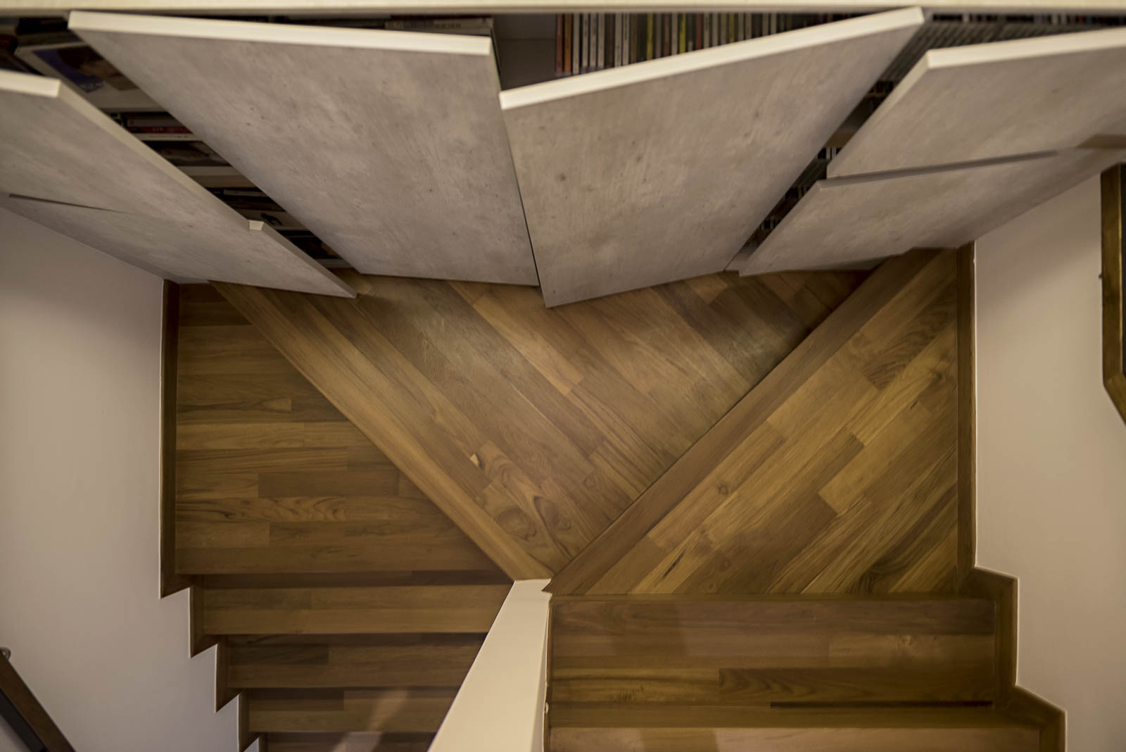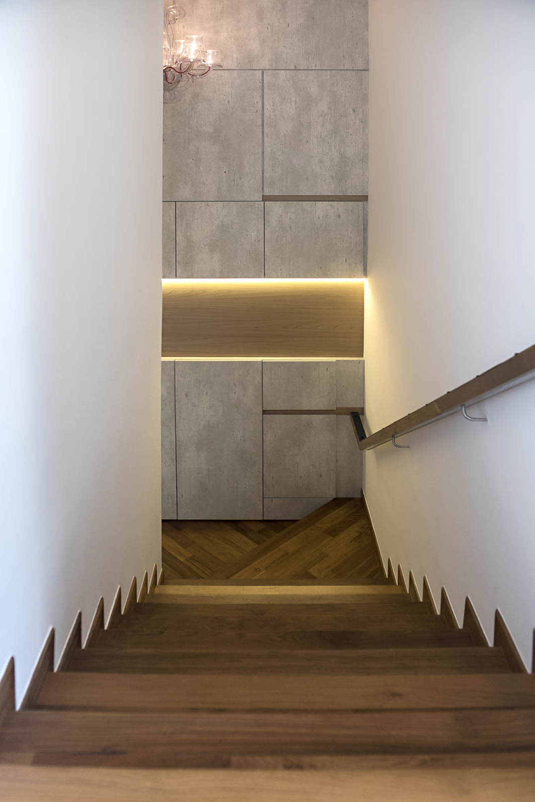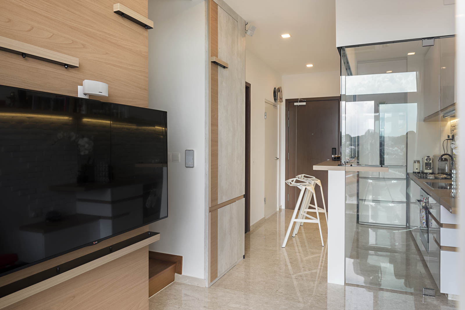 This is uninviting with no clear spatial boundaries within. We conceptualized the kitchen as a glass box, from which functions extend horizontally towards the living room, seemingly leading one's sight beyond to accentuate the long narrow space. A sliding TV panel opens up to the double volume staircase that leads up to the couple's sanctuary where their master bedroom with a connecting roof top terrace resides. Horizontality and continuity is the constant design language to tie the two levels, reinforced by the black metal plate and bolt detailing throughout the apartment.
