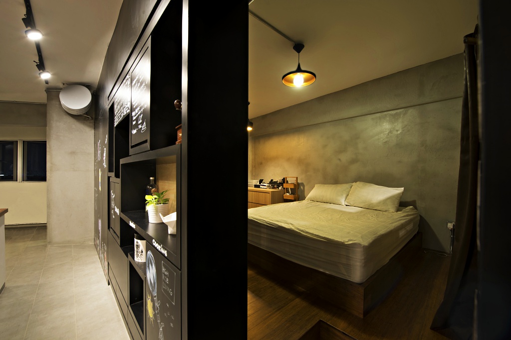 This is a 3rm HDB resale apartment nestled in one of the busiest district in Singapore, Bugis. We did a re-layout and designed the master bedroom as a "porous" black box. As the single anchoring object in the apartment with visual connection to all areas of the apartment, it serves as a bookshelf, storage, display as well as a huge canvas for the lady owner who loves to draw. Taking the cue from the couple's open-hearted, down-to-earth and free spirited character, we went ahead with an industrial chic approach using cement floor, bricks, timber, exposed piping and a splash of their favourite color.